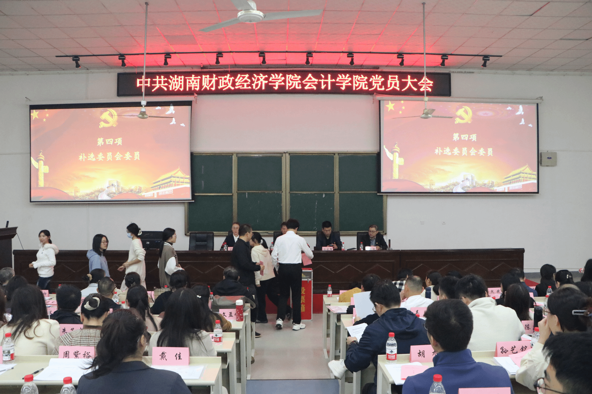 (本网讯)为加强基层党组织建设,健全组织机构,根据《中国共产党普通高等学校基层组织工作条例》和《关于同意部分二级党组织召开党员大会的批复》(湖财党发〔2025〕56号)的文件精神,2025年10月29日下午,会计学院党委在第二教学楼2J01教室召开党员大会,增补学院党委委员。学院全体师生正式党员参加会议,学院联系领导、校党委委员、副校长潘爱民出席会议。会议由院党委副书记肖芳主持。