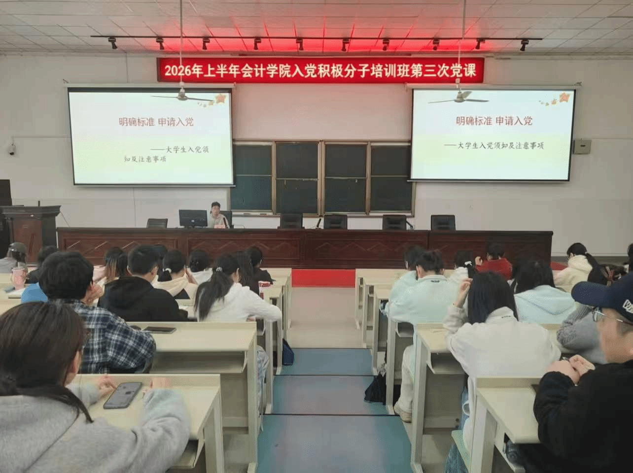 (本网讯)2026年4月16日中午,会计学院2026年上半年入党积极分子培训班第三次党课在第二教学楼2J01教室顺利举行。本次培训以“明确标准 申请入党”为主题,由会计学院学生第四党支部书记张繁主讲,全体学员参加。