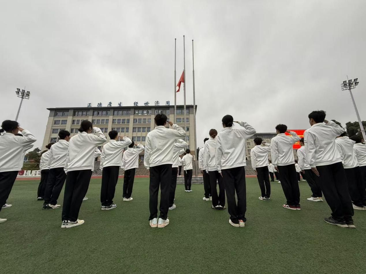 仪式开始,国旗护卫队护送国旗入场,全体师生神情肃穆、整齐肃立,向国旗行注目礼。