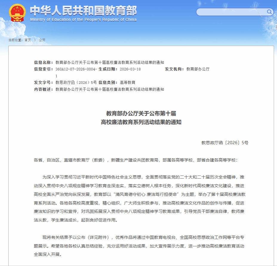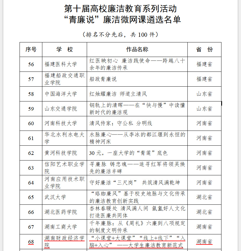 近日,教育部第十届高校廉洁教育系列活动遴选结果公布,我校马克思主义学院报送的微网课《“小课堂+大课堂”“线上+线下”“入脑+入心”——大学生廉洁教育新范式》成功入选“青廉说”廉洁微网课遴选名单。