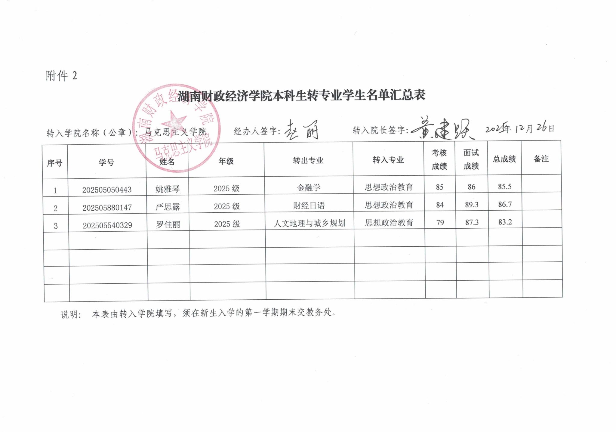 根据湖南财政经济学院《关于印发〈湖南财政经济学院全日制本科生转专业管理办法(试行)〉的通知》(湖财校发〔2025〕130号)、《关于2025级新生转专业有关事项的通知》(湖财教通〔2025〕154号)以及《马克思主义学院2025级新生转专业工作方案》的文件要求,马克思主义学院本科生转专业工作领导小组根据综合考核成绩确定通过转专业考核学生名单如下,特此公示。公示时间为2025年12月28日至2025年12月30日。如有异议,请于公示期内通过电话或书面材料向本单位反映。