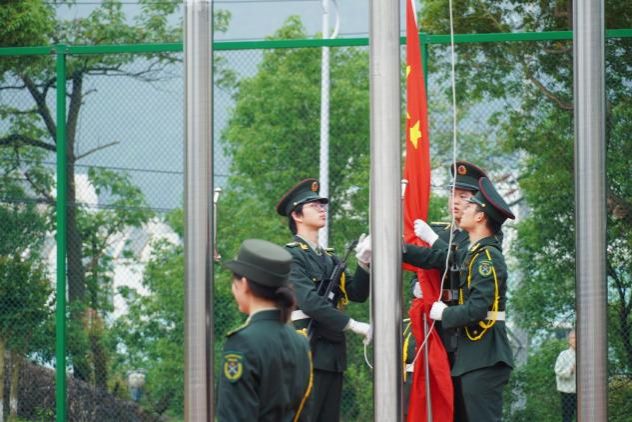 当国歌奏响,鲜艳的五星红旗冉冉升起,迎风飘扬,全体师生共唱国歌,行注目礼。当国旗到达杆顶的一刻,全体师生心中的激动与自豪油然而生,全场一片肃静。