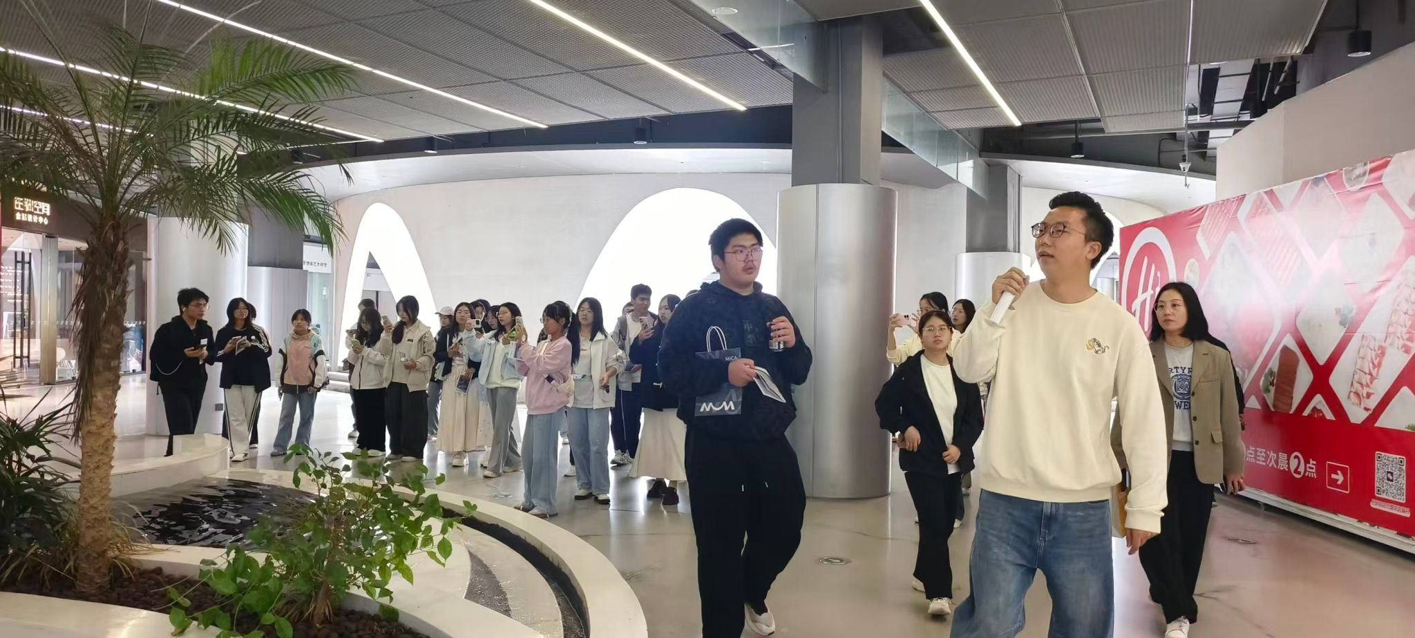 抵达梅溪湖艺术博物馆后,场馆华老师受邀担任特邀讲解员,为同学们开启了一场沉浸式艺术探索之旅。华老师从建筑设计理念出发,细致解读了场馆“线条流畅如行云流水、图形映衬显空间层次、室内外光影交相辉映”的三大特色,通过实地指引同学们观察不同区域的光影变化、空间布局,让大家直观体会到艺术的独特魅力。