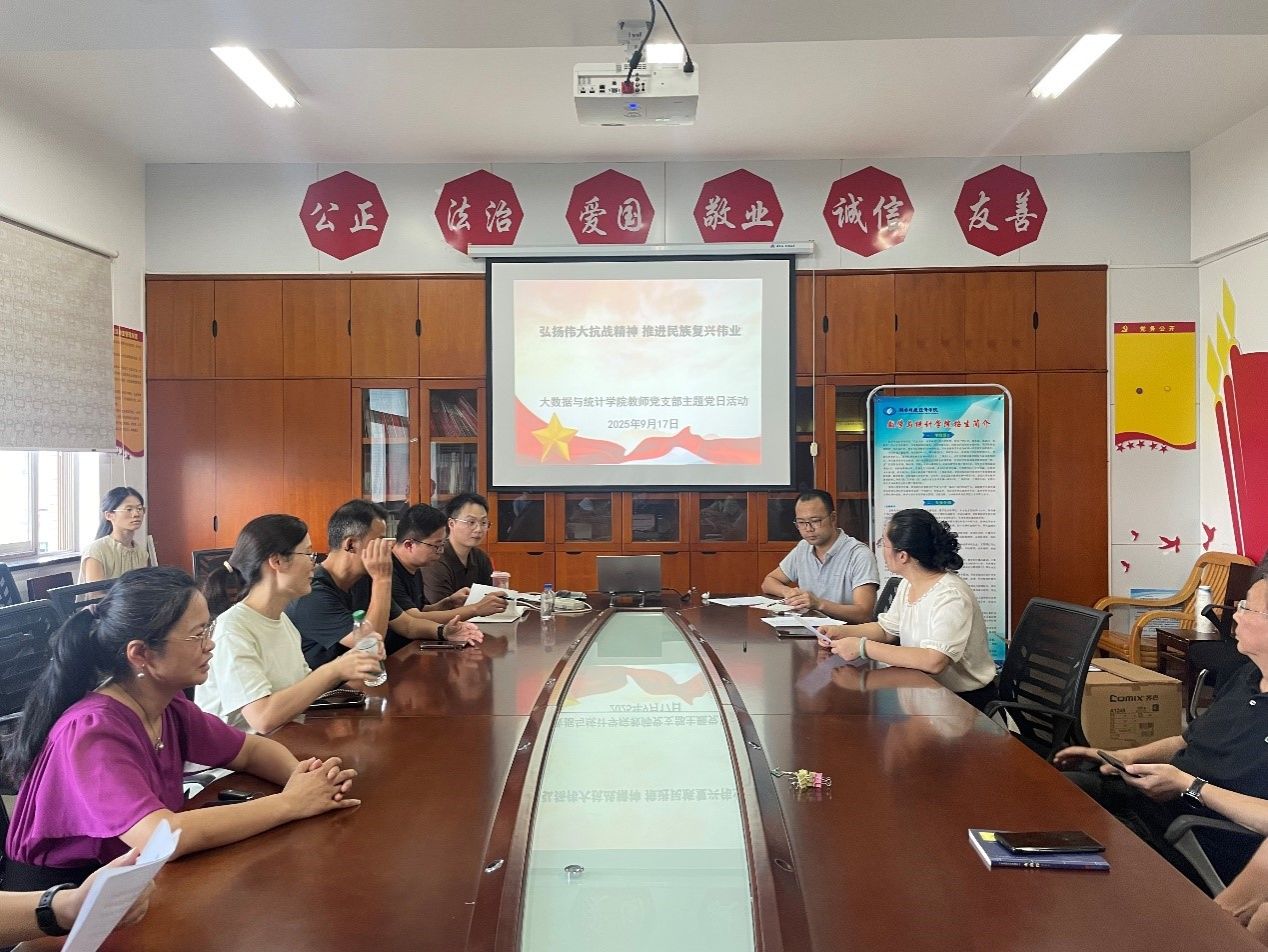 2025年9月17日下午,大数据与统计学院教师党支部在办公楼809会议室开展“弘扬伟大抗战精神,推进民族复兴伟业”主题党日活动。本次党日活动由支部副书记李葛主持,全体教师党员参加。活动首先组织全体党员集中观看了教育片《中国共产党人精神谱系第7集:抗战精神》。随后,大家在易思维同志的带领下,深入学习了习近平总书记在纪念中国人民抗日战争暨世界反法西斯战争胜利80周年大会上的讲话精神以及《习近平谈治国理政》第五卷。黄岩朔同志结合观看纪念中国人民抗日战争暨世界反法西斯战争胜利80周年大会后的感受,...