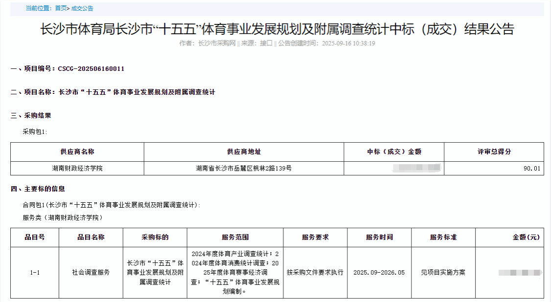 该中标项目是学校师生团队深度服务地方政府、践行产教融合的又一重要成果。项目内容涵盖《长沙市“十五五”体育事业规划》、《长沙市推进国家体育消费与赛事经济试点城市建设三年行动计划(2025-2027年)》的编制工作,以及《2024年度长沙市体育产业统计》、《2024年度长沙市居民消费调查》、《2025年度长沙市赛事经济统计》等多项核心任务。