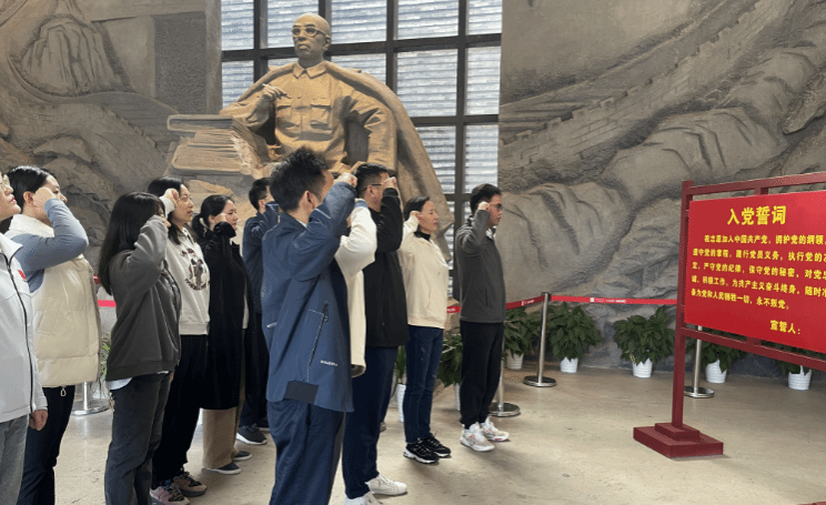 上午,直属党支部党员来到长沙县田汉文化园,在讲解员的引导下,深深体会了一段中华民族在最危险的时候永载史册的红色记忆,也感受到了田汉通过传统戏剧改革经验的总结而生发出的对艺术革命的发展方向和精神主旨的深层思考。在田汉以人民为本位的艺术立场熏陶下,体育学院全体党员自发来到田汉铜像前,面对党旗,重温入党誓词。