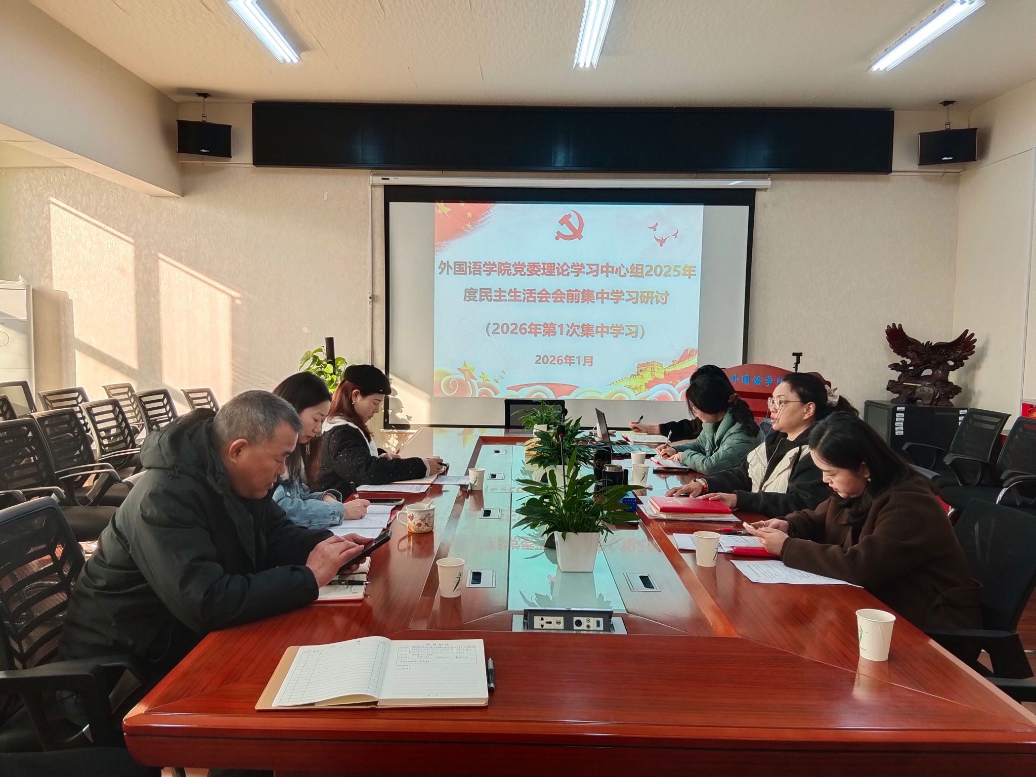 (本网讯)为铸牢思想根基、凝聚奋进力量,高质量开好2025年度民主生活会,1月9日上午,外国语学院在办公楼315会议室召开民主生活会会前集中学习研讨会。学院班子成员、党委委员参加会议,会议由院党委书记凌飞主持。