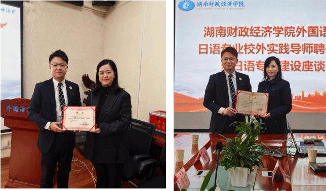学院正式聘任蒋磊会长为“湖南财政经济学院外国语学院日语专业校外实践导师”。同时,蒋会长聘请日语系学科带头人付敏老师为“西日本湖南商会学者分会高级顾问”。