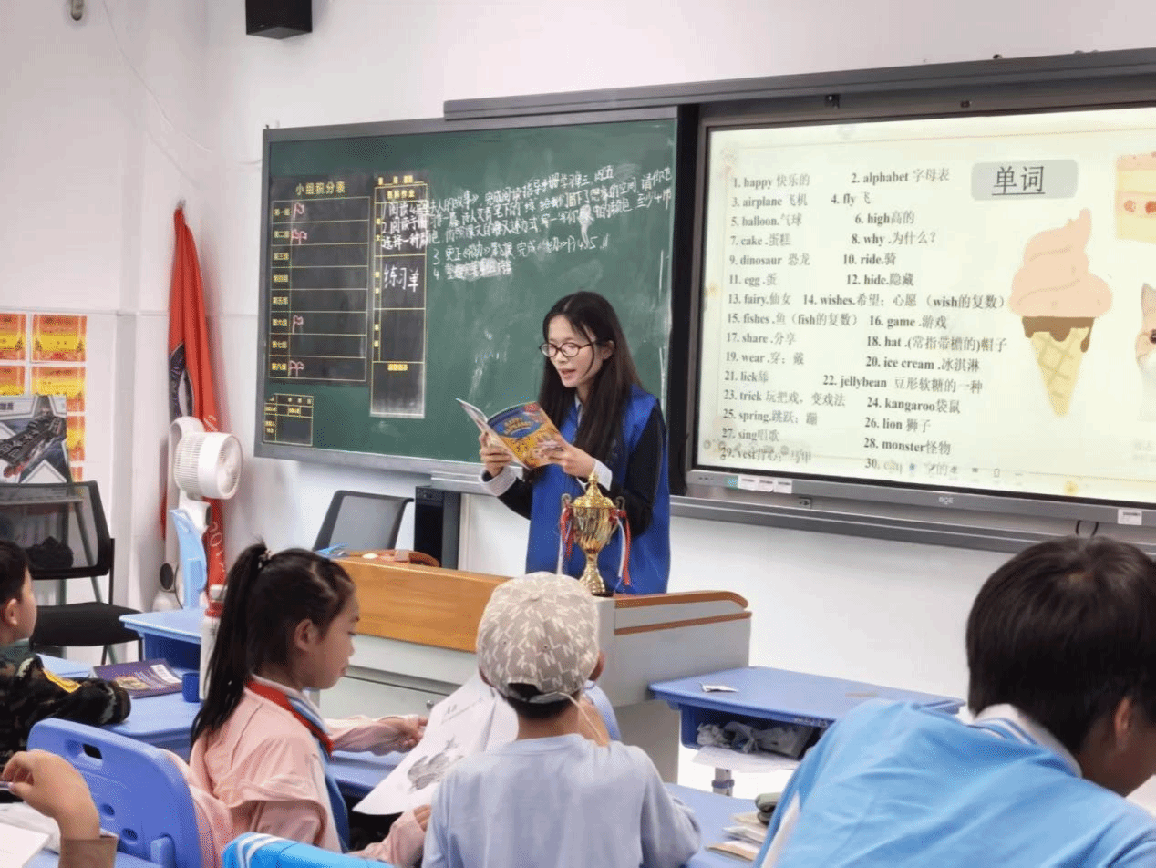 (本网讯)4月23日,第31个“世界读书日”如约而至。为积极响应全民阅读号召,助力书香校园建设,外国语学院“语翼飞翔”志愿服务协会的志愿者老师们走进岳麓一小枫林学校,为四年级学子带来一场趣味盎然的英语绘本阅读课,用书香为孩子们的成长添上了一抹亮丽的色彩。