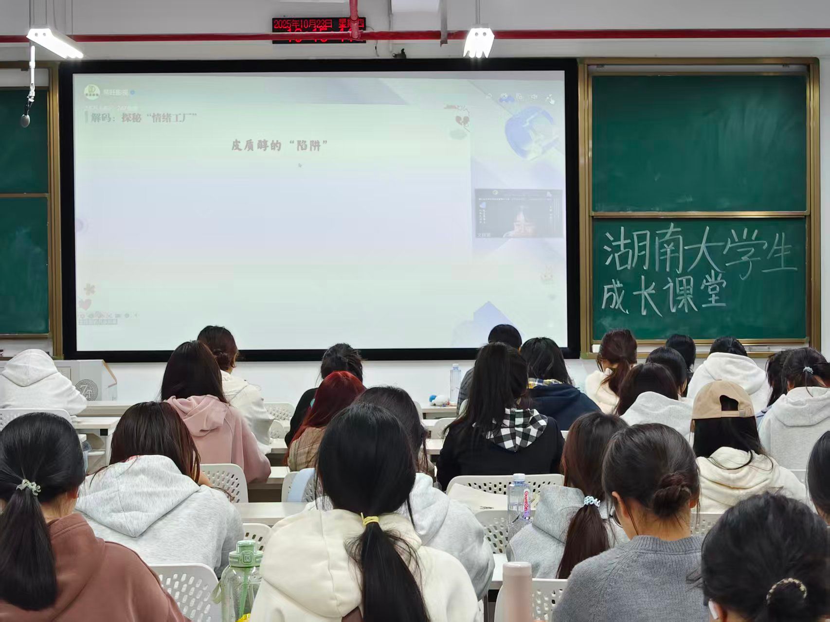 (本网讯)2025年10月23日晚,我校学生工作部心理中心组织全校近6000名大一新生集中收看《湖南省大学生成长讲堂》第十三讲——“解码情绪奥秘:从心海暗涌到自在乘风”专题讲座。本次讲座作为我校“2025年世界精神卫生日”系列活动的重要组成部分,旨在帮助学生深入理解情绪本质,掌握情绪调节技能,提升心理健康素养。