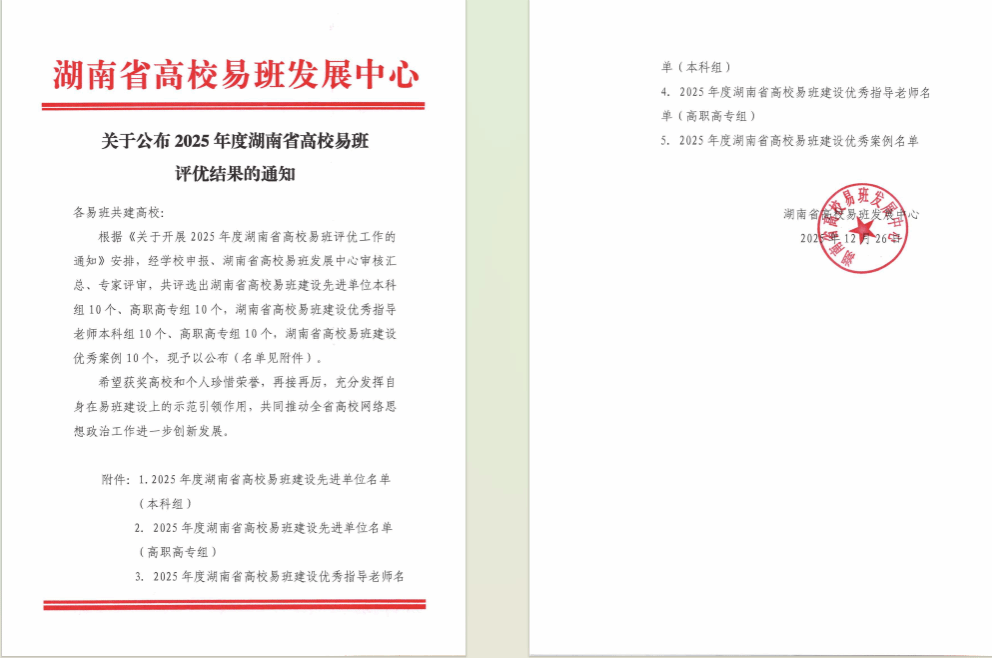 (本网讯)近日,湖南省高校易班发展中心发布《关于公布2025年度湖南省高校易班评优结果的通知》,我校荣获“湖南省高校易班建设先进单位”,这是我校连续第八年荣获此项荣誉。学生工作部周雅荣获“2025年度湖南省高校易班建设优秀指导老师”。推选案例《易班筑防线,云端铸国防——子悦工作室网络育人赋能国防教育实践》荣获“2025年度湖南省高校易班建设优秀案例”。