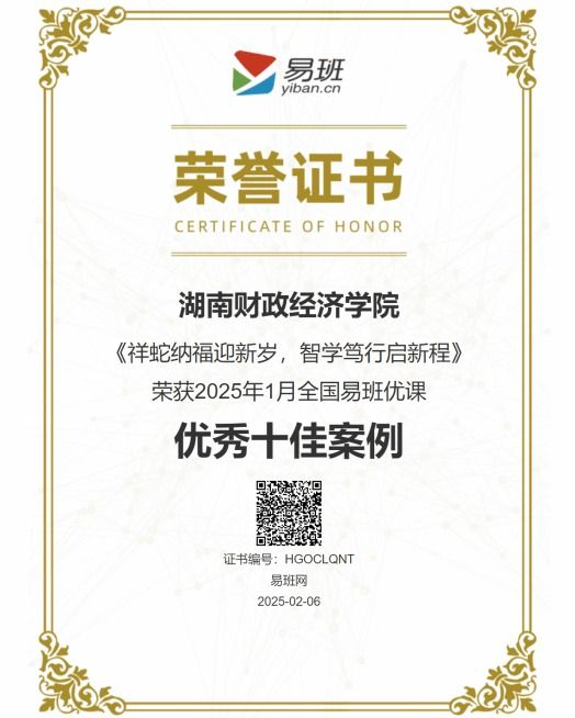 (本网讯)喜报!教育部易班发展中心公布 2025 年 1 月全国易班优课优秀十佳案例评选结果,我校《祥蛇纳福迎新岁,智学笃行启新程》项目成功入选,斩获这一殊荣。