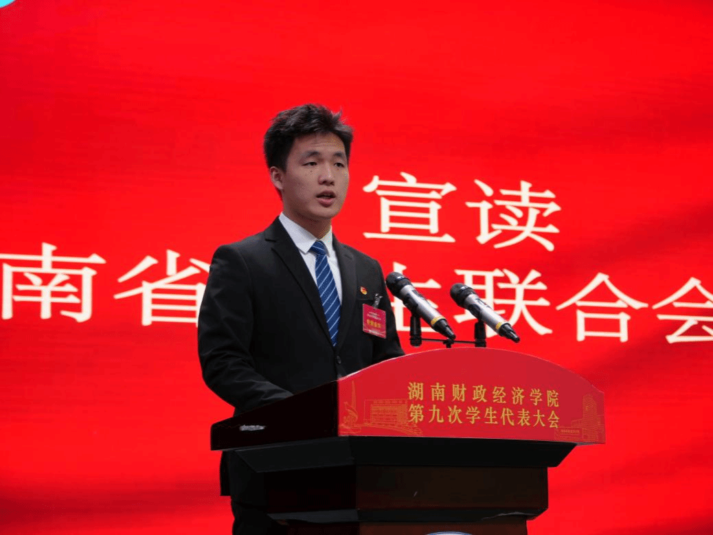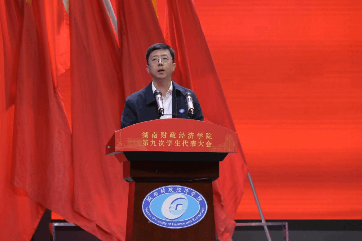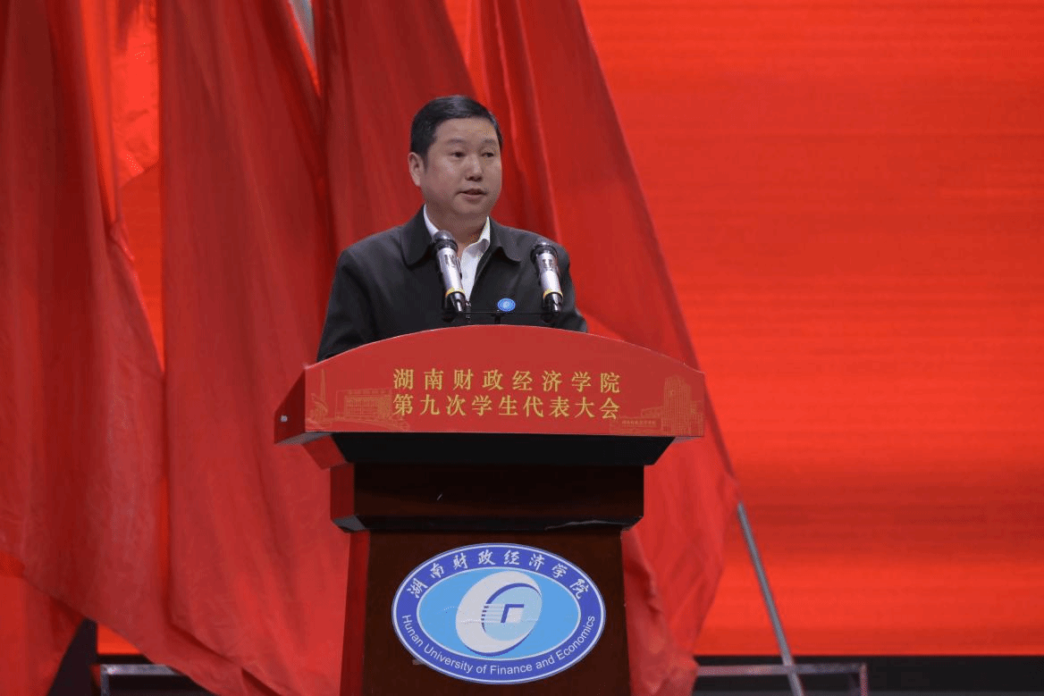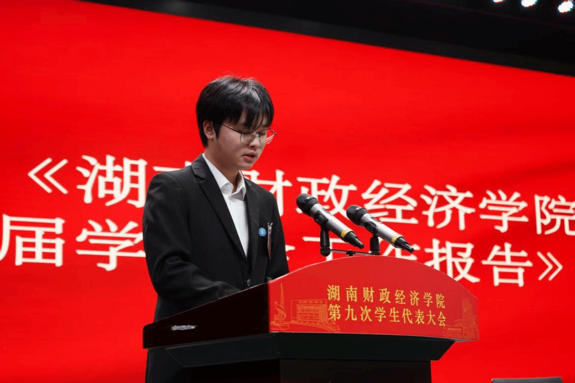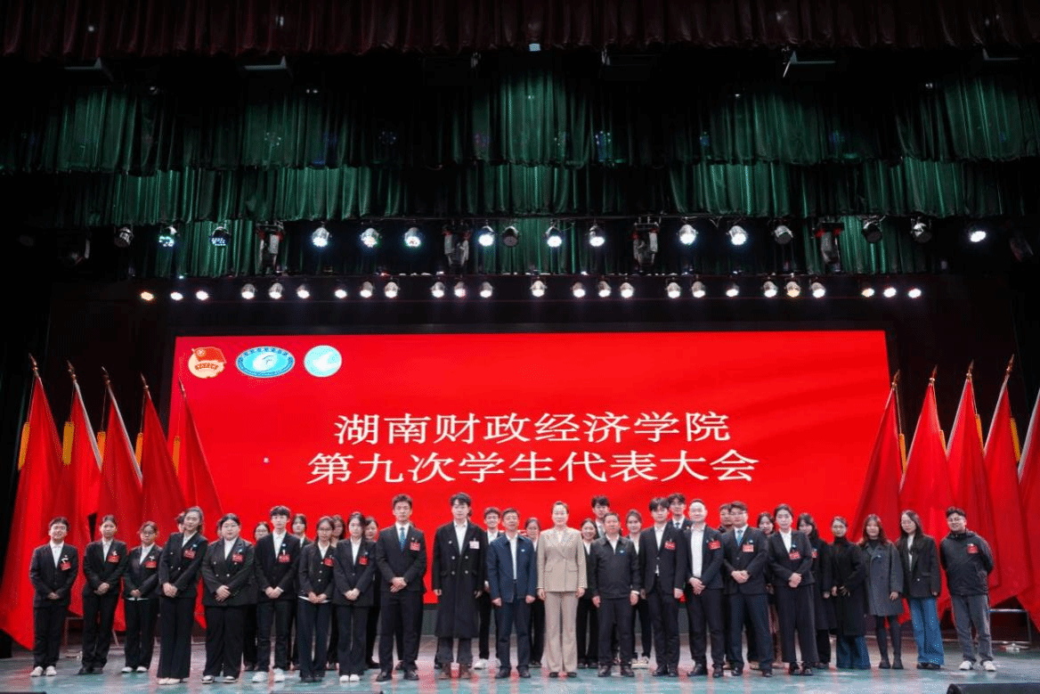 2025年11月22日,湖南财政经济学院第九次学生代表大会开幕会在主校区大礼堂召开。校党委副书记苏玲、校党委学生工作部部长欧阳海峰、校团委书记刘天浩,校团委全体老师、各二级学院团总支书记、省学联驻会主席李鑫出席会议,学代会正式代表和兄弟高校学生会特邀代表共计300余人参会。会议由我校第八届校学生会执行主席钟博康主持。