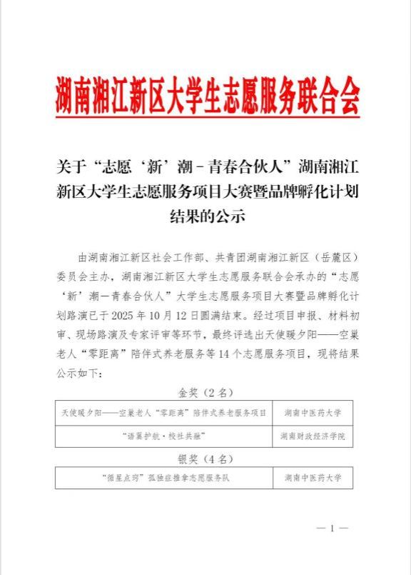 为促进高校志愿服务项目化、专业化与品牌化发展,10月12日下午,由湖南湘江新区社会工作部、共青团湖南湘江新区(岳麓区)委员会主办,湖南湘江新区大学生志愿服务联合会承办的“志愿‘新’潮-青春合伙人”大学生志愿服务项目大赛暨品牌孵化计划路演,于湖南湘江新区桔子洲街道学堂坡社区成功举行。我校语翼飞翔志愿服务队凭借申报的“语翼护航·校社共融”项目,在外国语学院党委副书记张鹏老师的悉心指导下,从七十余个参赛项目中脱颖而出,荣获大赛金奖。