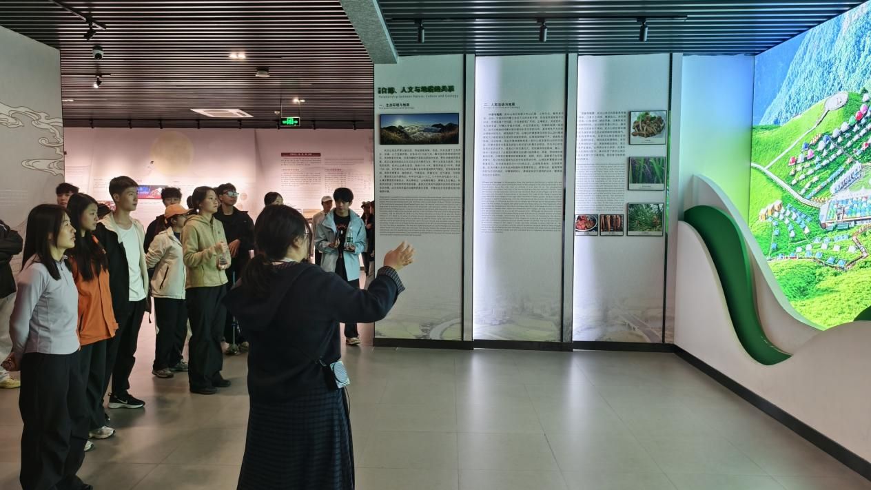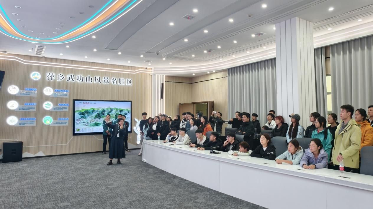 徒步启程前,学子们走进武功山地质公园博物馆。在讲解员的引导下,大家系统了解武功山地貌演化、生态资源特征,深入学习景区旅游产业布局——从核心资源定位、品牌营销策略,到区域信息管理平台建设、户外服务保障体系,全方位解码武功山成为“户外热门地”的底层逻辑,为后续徒步实践筑牢理论基础。