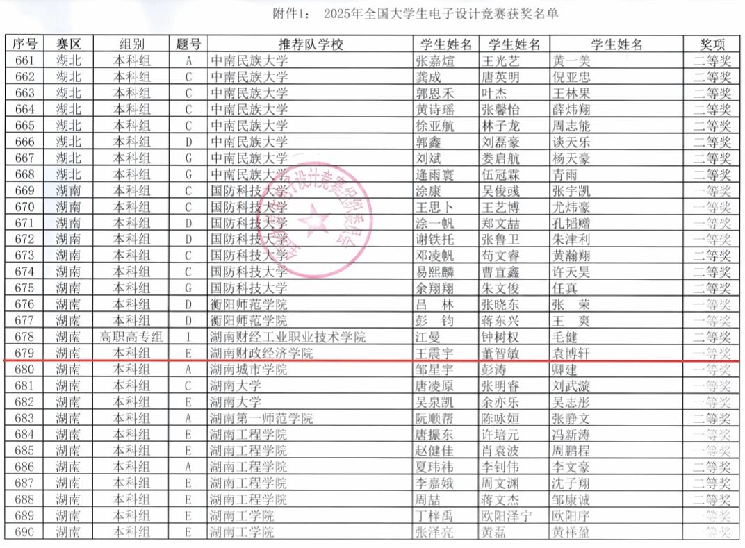 近日,2025年全国大学生电子设计竞赛国测获奖名单正式揭晓,湖南财政经济学院代表队荣获国家级一等奖,创造了学校在该项顶级赛事中的历史最好成绩,也是在工科应用类A类学科竞赛中国家级奖项零的突破。