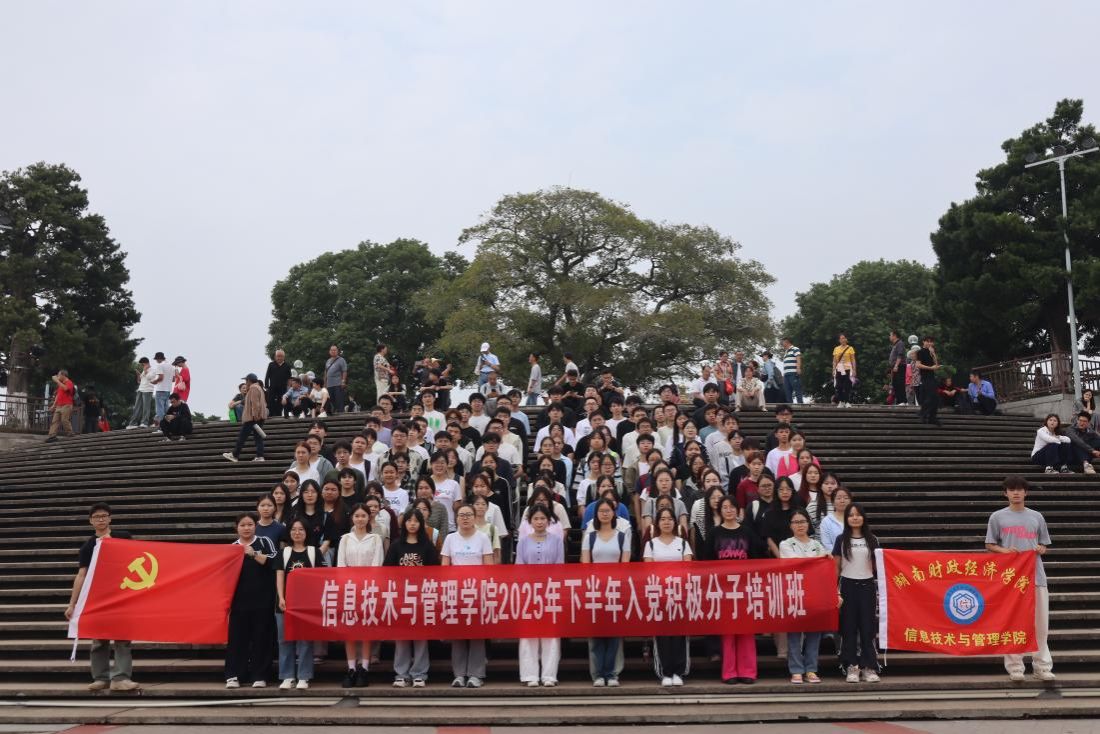 为深入学习贯彻党的二十大精神,进一步加强入党积极分子的理想信念教育,传承红色基因,厚植爱党爱国情怀,2025年10月15日下午,信息技术与管理学院分党校组织2025年下半年入党积极分子培训班学员共111人,赴橘子洲开展“探寻红色足迹 感悟校史荣光”主题教育实践活动。