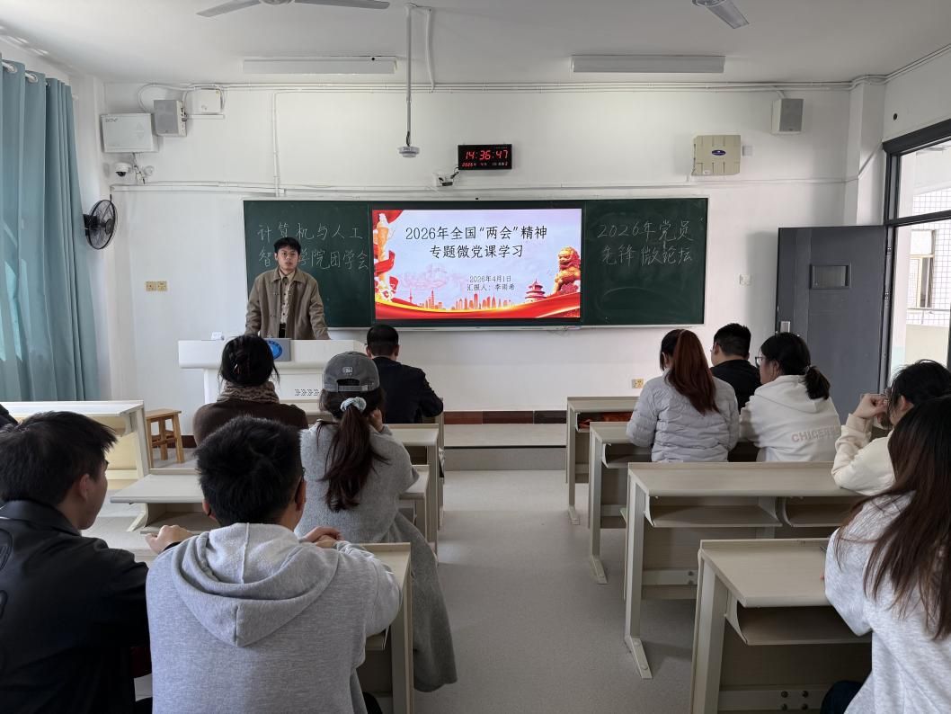 在专题微党课中,李雨希围绕2026年全国两会精神,重点就会议基本情况、习近平总书记重要讲话精神、政府工作报告核心内容以及“十五五”规划纲要等进行了解读。他还结合“十五五”规划纲要中“支持青年发展”等章节,引导学生骨干深刻认识国家战略对青年科技人才的迫切需求,思考如何将计算机科学与技术、人工智能等专业学习,同发展新质生产力、推动关键核心技术攻关等时代命题紧密结合,从而科学规划个人成长路径。
